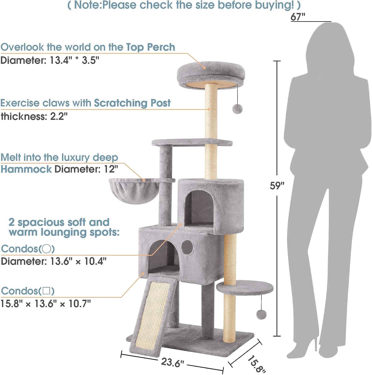 MARKIF presents the ultimate feline playground - a 59" high multi-level cat tree that redefines your cat's indoor experience. Our cat tree is a spacious retreat for your furry friends, featuring two warm condos large enough to accommodate up to four kittens comfortably. Whether they're seeking adventure, relaxation, or a cozy nap, our versatile cat tree caters to all your cats' life needs.