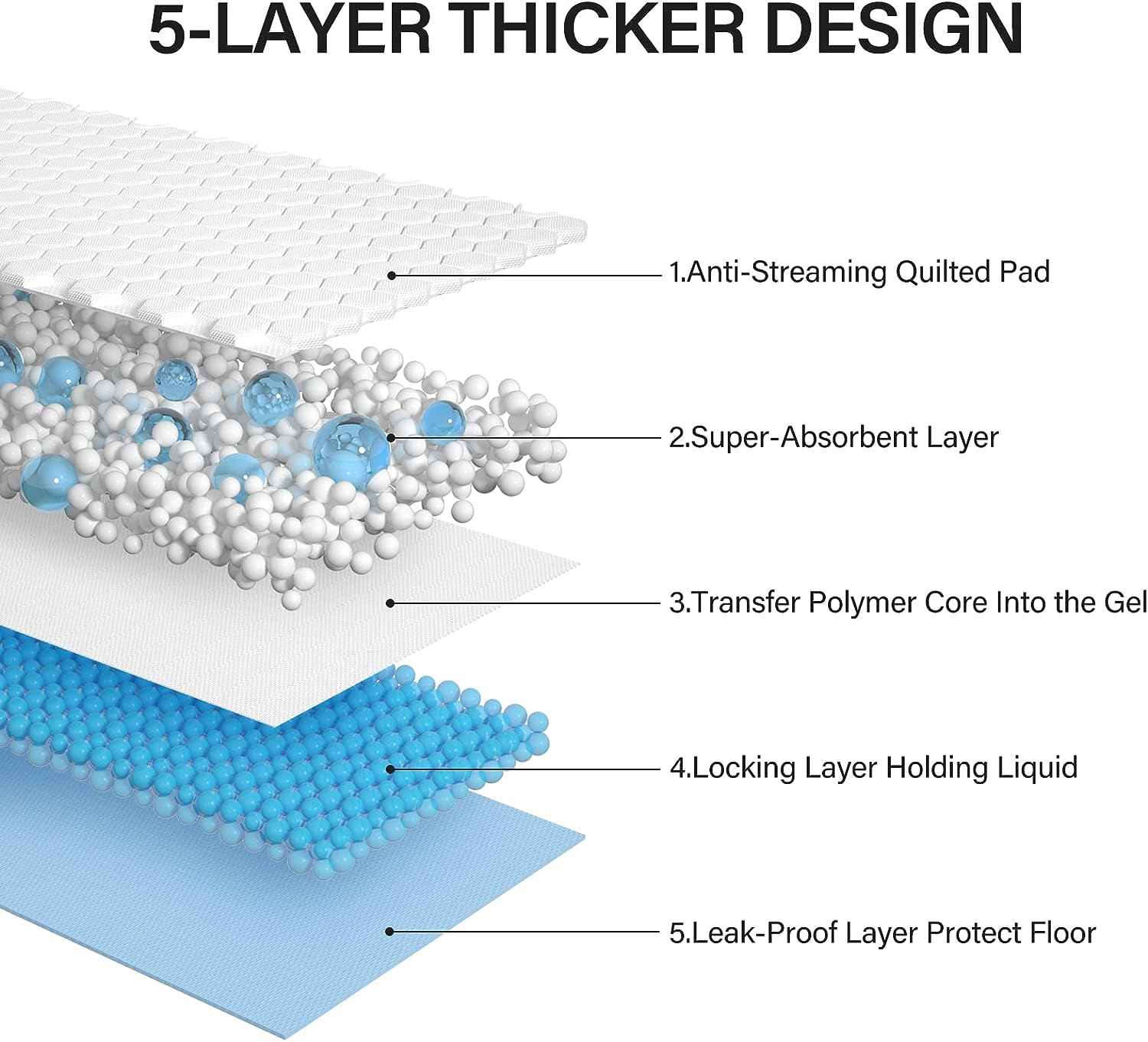 2.Unmatched Absorbency: These pads are not just your average training pads; they are engineered with a cutting-edge five-layer design that boasts extraordinary absorbency. Thanks to their exceptional water-lock technology, these pads effectively lock in moisture, leaving the surface dry and your home pristine.